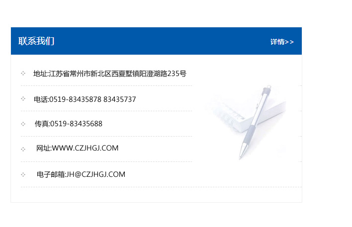 傳真:0519-83435688    郵編:213135    網址:WWW.czjhgj_com.shxycl.com    電子郵箱:JH@czjhgj_com.shxycl.com